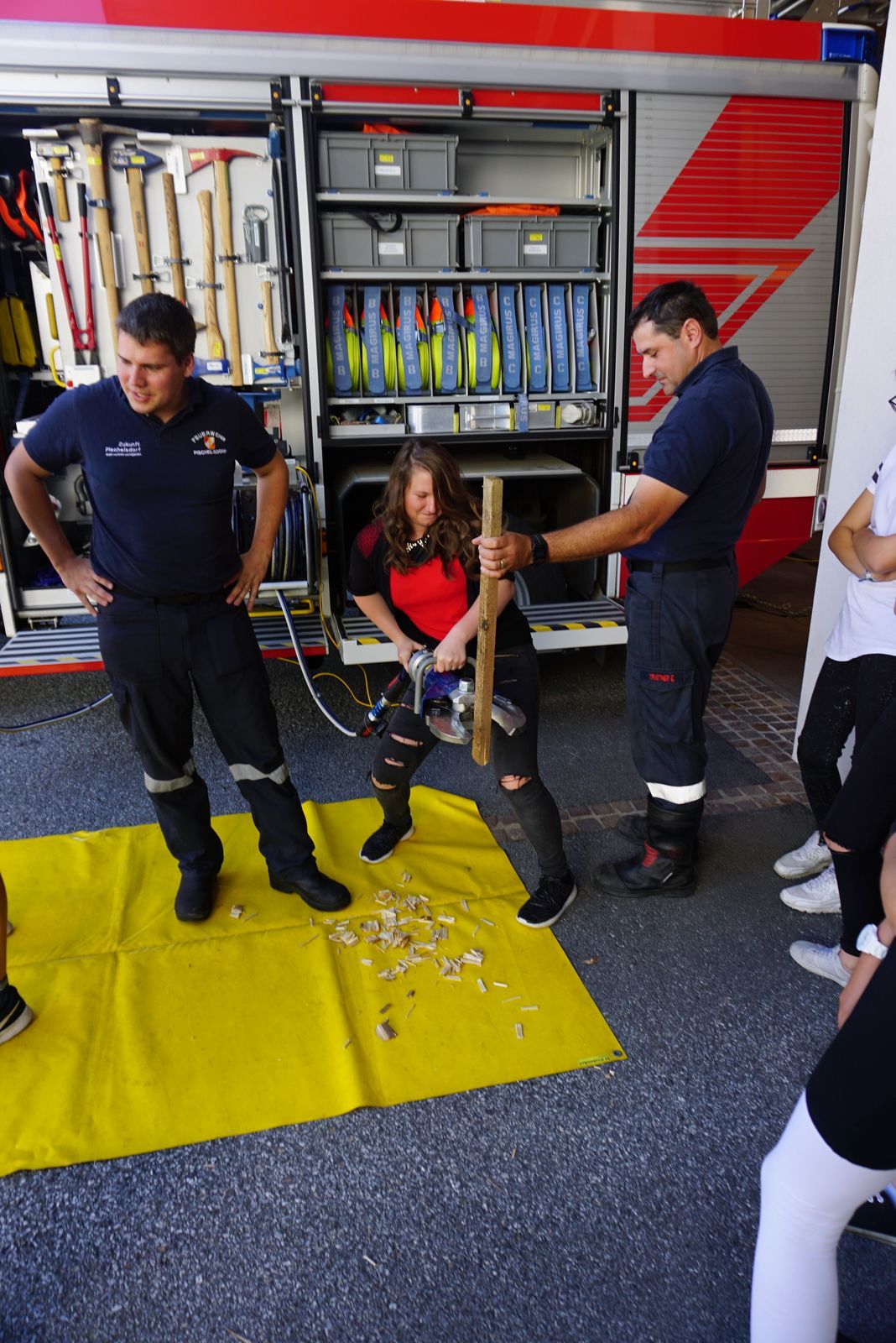 Aufgeteilt auf mehrere Stationen wurde den Jugendlichen Geräte, die in unterschiedlichsten Einsätzen benötigt werden, vorgeführt. Bei einer Station ging es um Einsätze, bei denen Personen aus gewissen Höhen gerettet werden müssen. Eine andere Station widmete sich dem Umgang mit dem Strahlrohr. Zusätzlich konnten die Schüler Geräte wie Hebekissen, und Hydraulisches Rettungsgerät selbst ausprobieren.